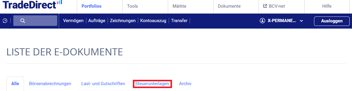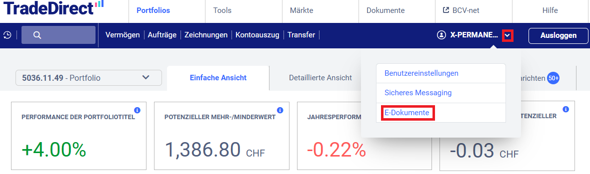 Melden Sie sich an und klicken sie auf den Pfeil oben rechts und anschliessend auf «E-Dokumente».
