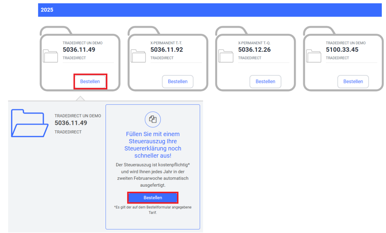 Falls Sie noch keinen Antrag zur automatischen Ausstellung des Steuerauszugs gestellt haben, müssen Sie das Bestellformular vor dem 6. Februar 2026 absenden.