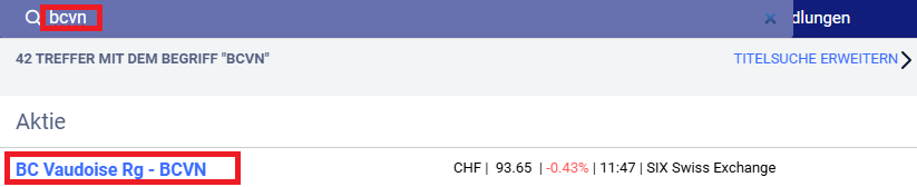 • Suchen Sie den gewünschten Titel mithilfe der Suchleiste und wählen Sie ihn aus. Sie können entweder mit dem Namen des Titels, seiner Valorennummer oder seinem Symbol suchen.